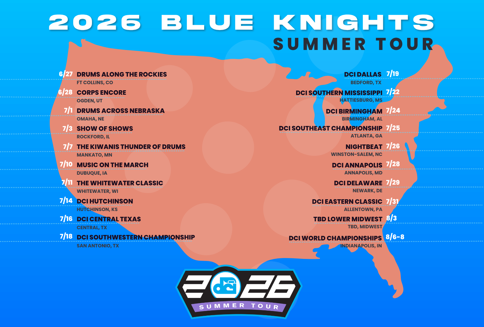 The Blue Knights 2026 tour schedule is here! We have a full season of exciting performances and we can’t wait to get back on the field for our audiences this summer. You can see the full season schedule, along with important ticket details and location information at dci.fan/BlueKnights26